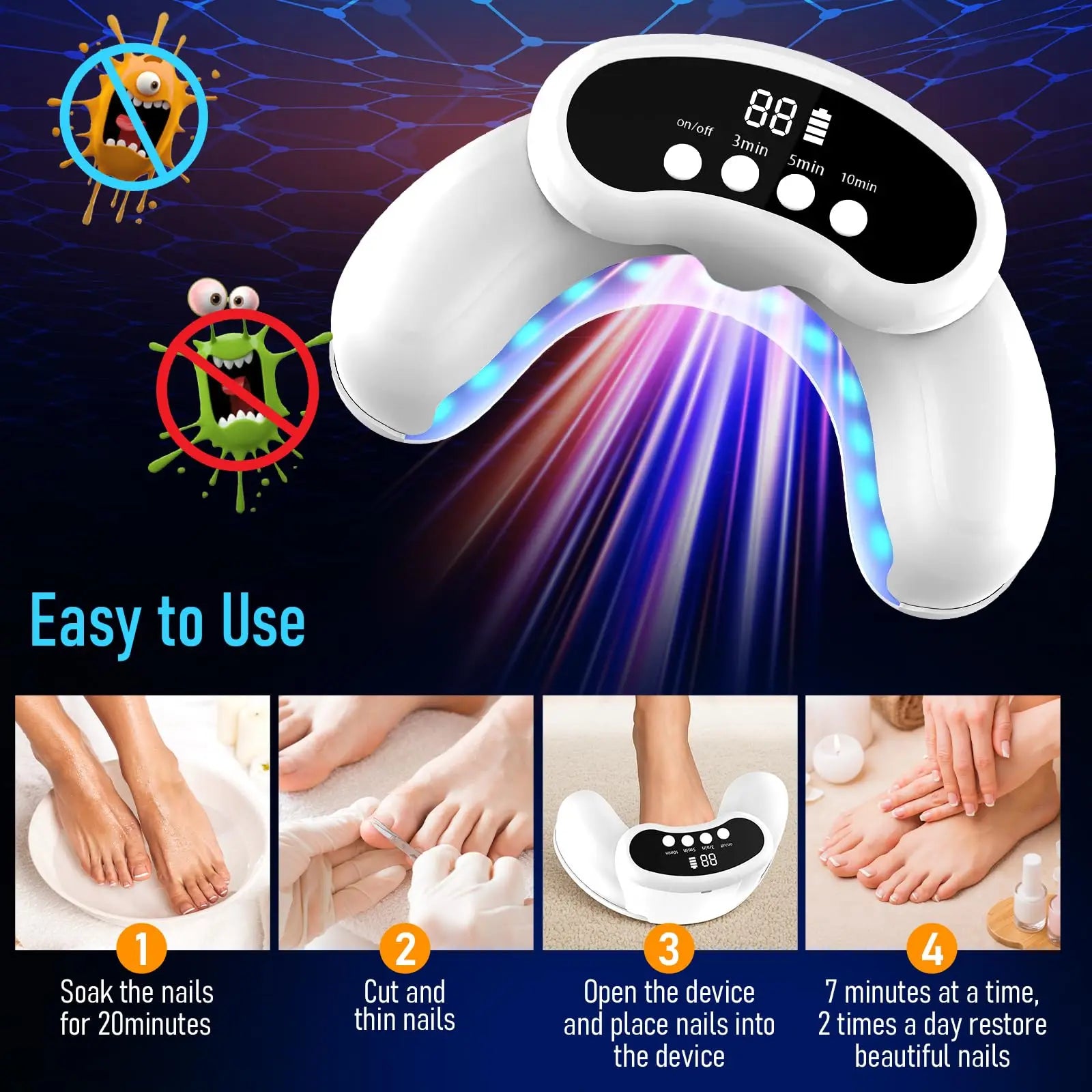 Easy to use: the device is user-friendly and easy to use. The device has 3 working hours (3/5/10 minutes) to choose from. You can use it easily and safely at home. Clean your hands or feet before use and trim the nails to the appropriate length. Place your finger or toe in the slot of the device and choose the desired time. It starts with the account below.